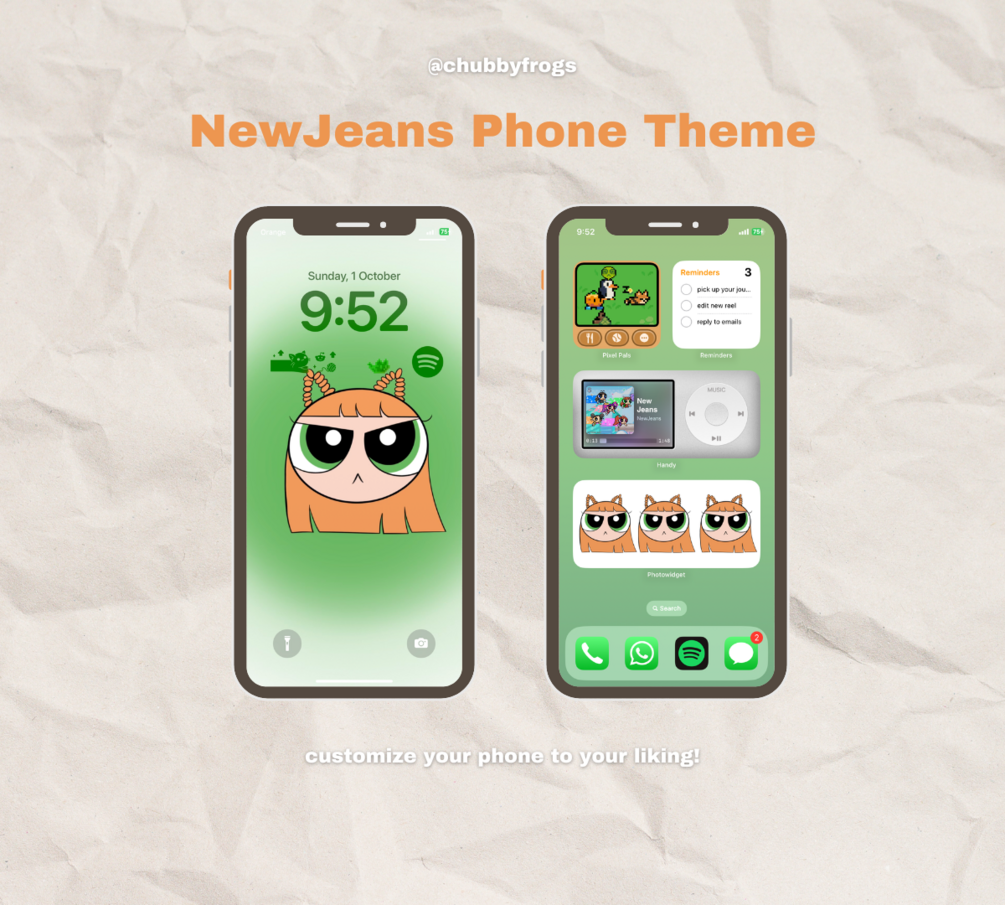 Transform your phone into a delightful display of NewJeans x Powerpuff Girls phone theme by @chubbyfrogs! 📱 This theme draws inspiration from the iconic collaboration between NewJeans and Powerpuff Girls, it comes packed with a total of 45 awesome elements to give your phone a truly unique and customized appearance.♡